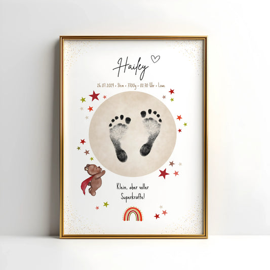 Verewige die ersten Hand- oder Fußabdrücke deines Babys auf einem liebevoll gestalteten, personalisierbaren Geburtsposter.
